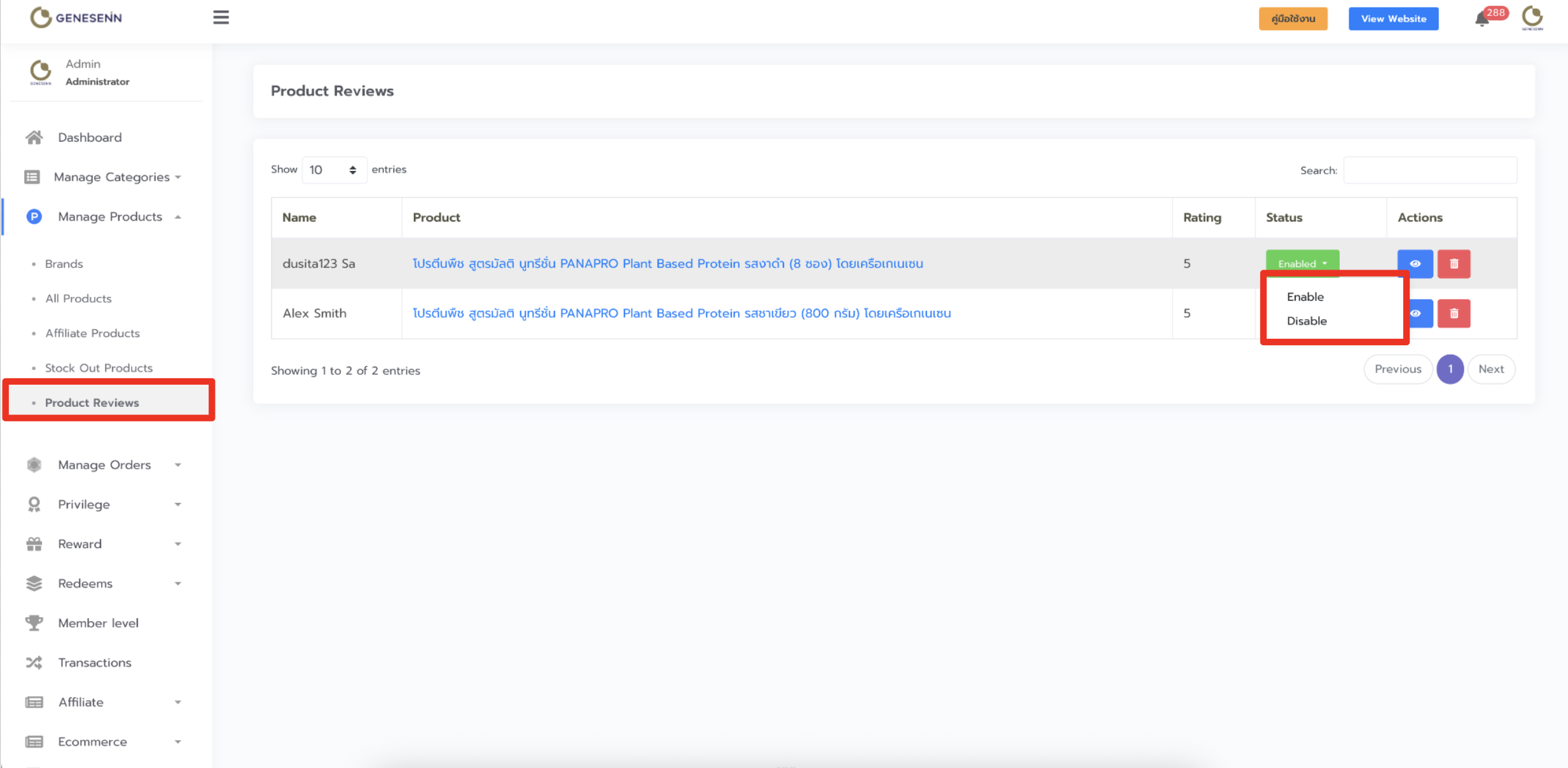 ไปที่คอลัมน์ Actions คลิ๊กตามรูปไอคอนเพื่อดูหน้ารีวิวสินค้า หรือ ลบ