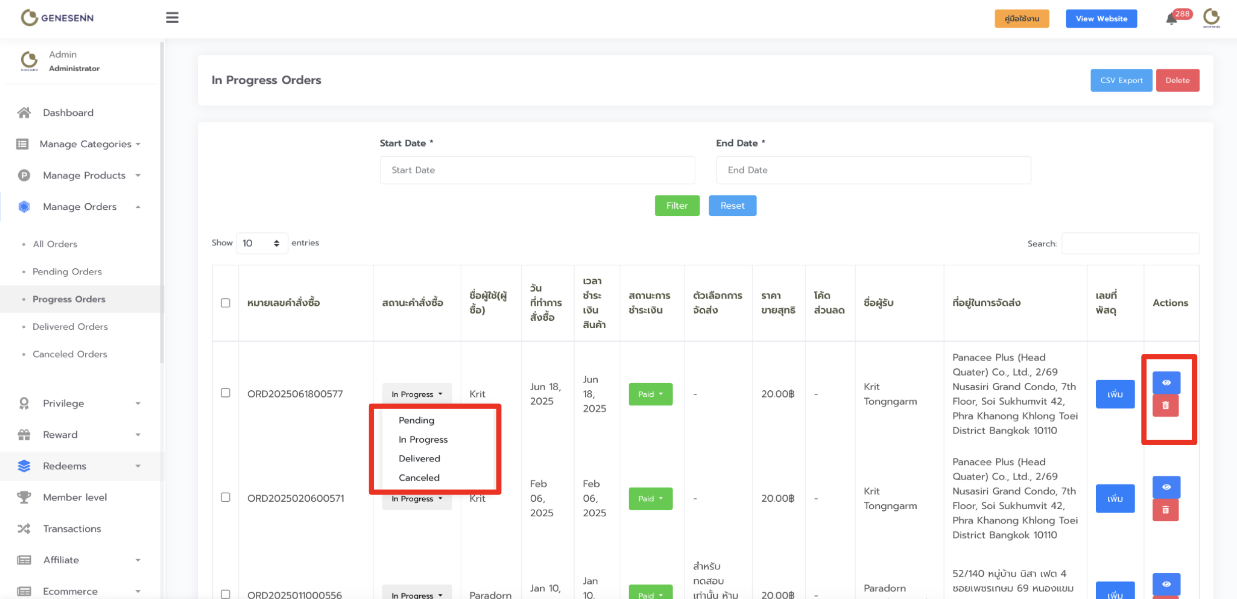 ไปที่คอลัมน์ Actions คลิ๊กตามรูปไอคอนเพื่อดูหน้าสั่งซื้อ หรือ ลบ