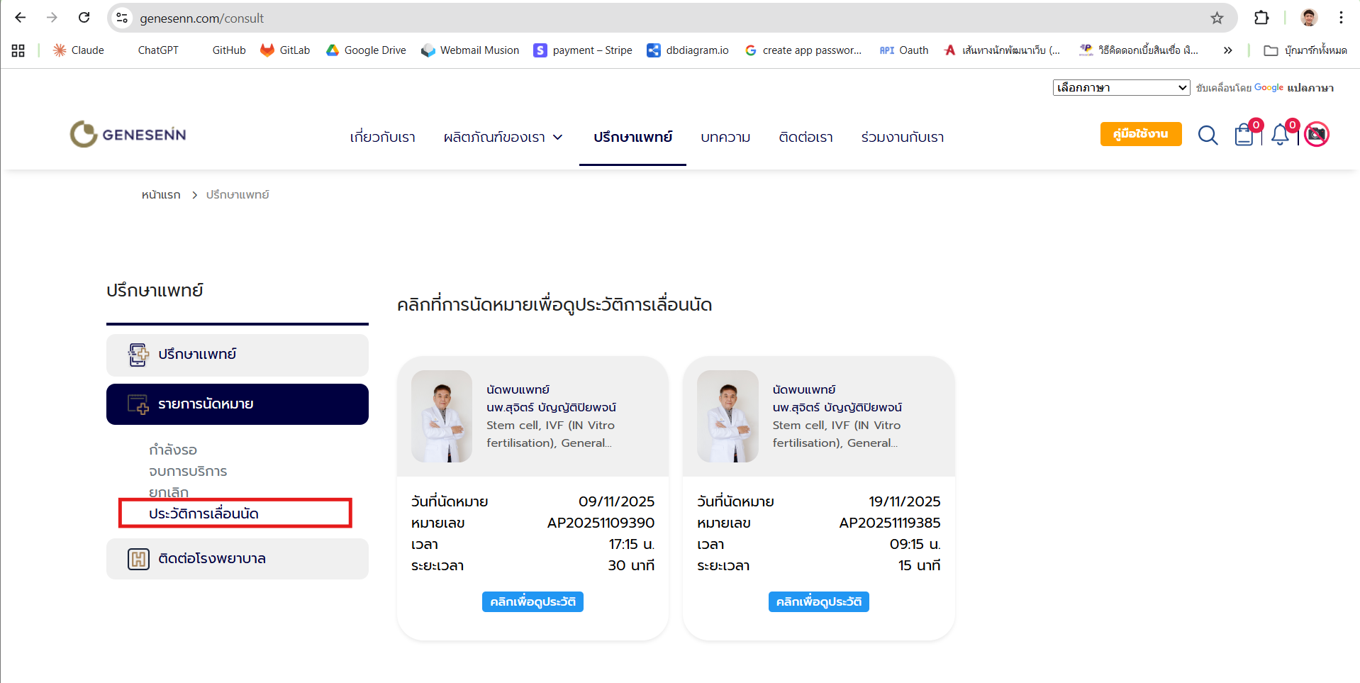 โดยถ้าหากเข้าไปที่ปุ่มดูประวัติจะแสดงรายการนัดหมายที่เคยเลื่อนไว้ดังภาพต่อไปนี้