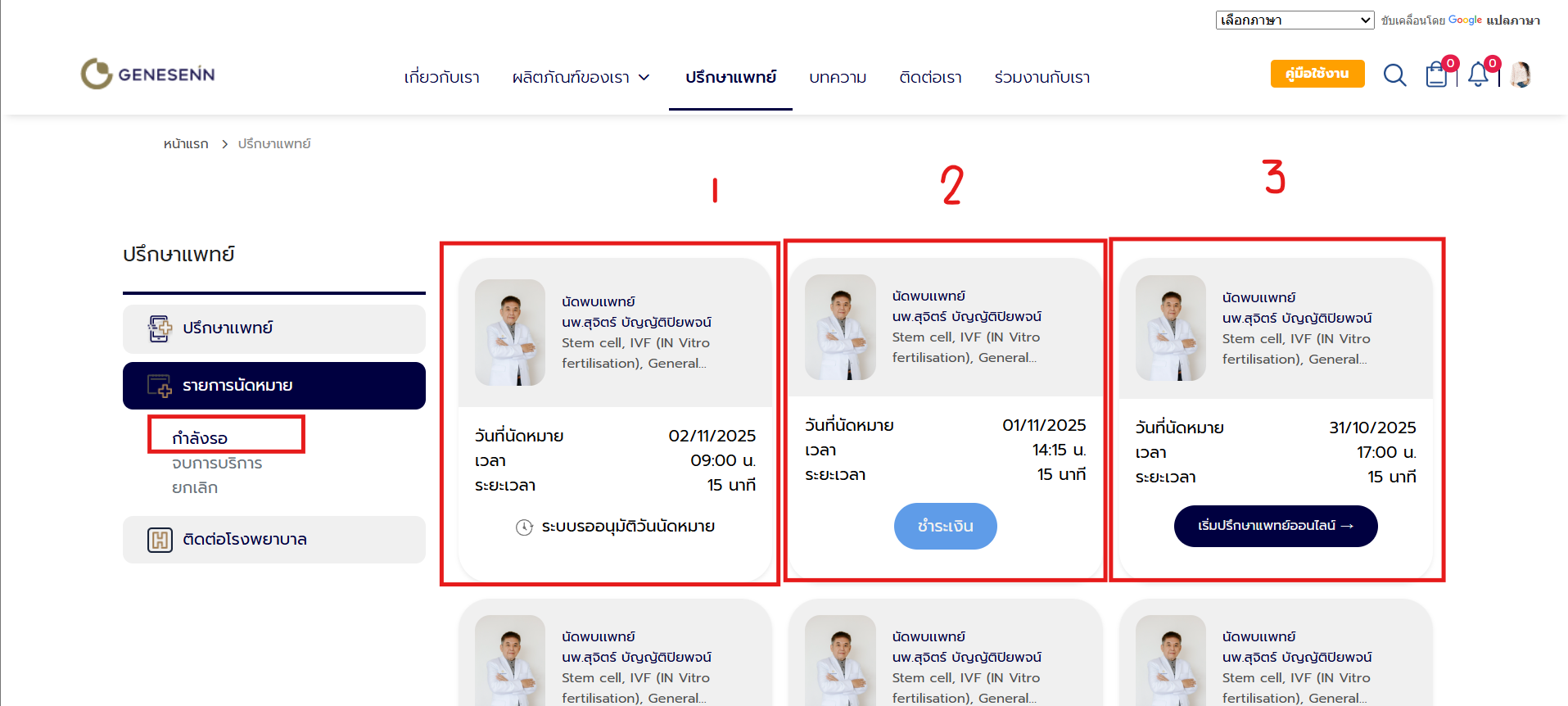 - ชำระเงินแล้ว และถึงเวลานัดหมายแล้ว และ แพทย์จะมีการเปิดห้องเพื่อวิดิโอคอล จะแสดงปุ่ม "เริ่มปรึกษาแพทย์ออนไลน์" (หมายเลข 3)