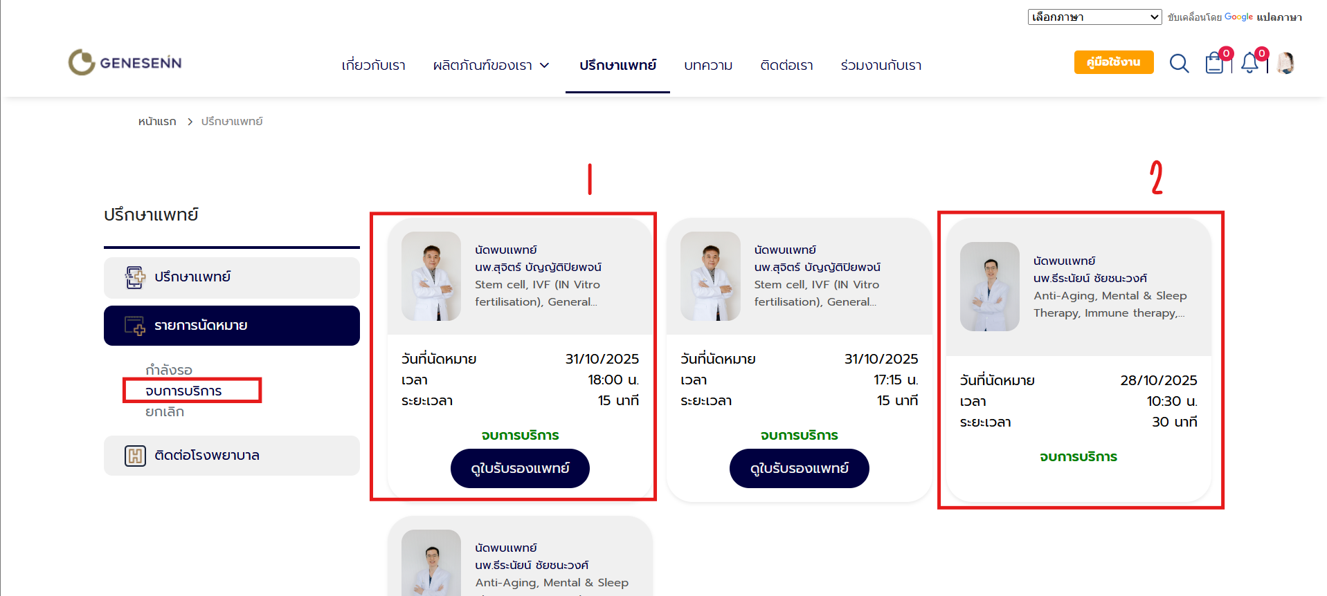 - มีการระบุขอใบรับรองแพทย์ (หากแพทย์มีการแนบใบรับรองแพทย์ไว้ จะแสดงปุ่ม "ดูใบรับรองแพทย์") (หมายเลข 1)
