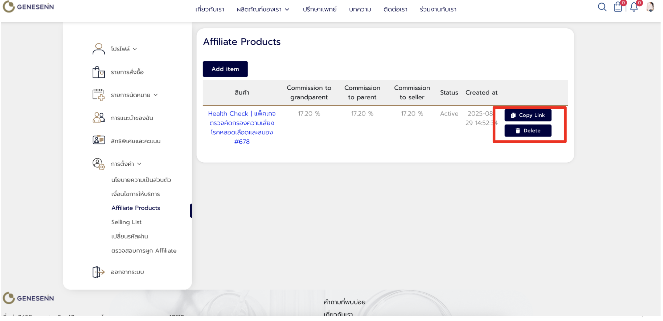 จะปรากฏหน้าต่างดังรูปภาพ สามารถ Copy Link หรือ Deleate สินค้าได้